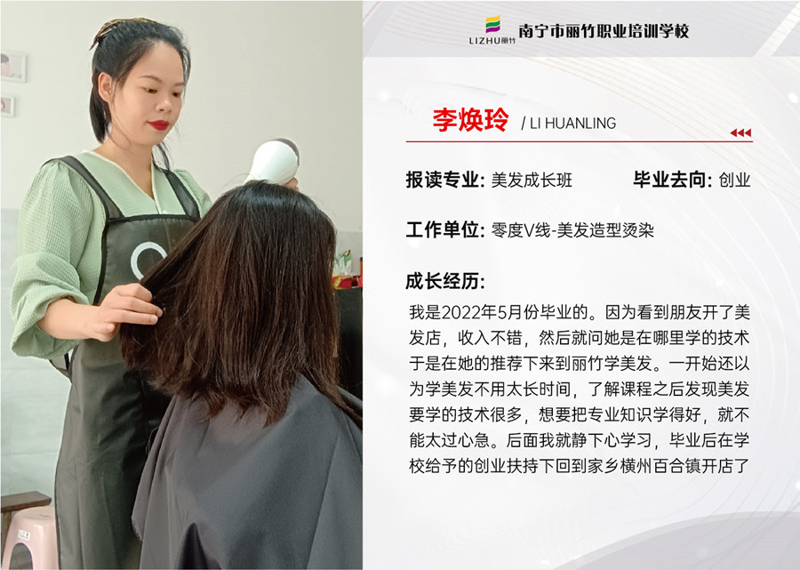 南寧美發(fā)創(chuàng)業(yè)、南寧美發(fā)創(chuàng)業(yè)發(fā)展:南寧美發(fā)專(zhuān)業(yè)學(xué)校-麗竹學(xué)校的招生前臺(tái),一場(chǎng)溫馨的見(jiàn)面會(huì)正在上演。22級(jí)美發(fā)全能班的方冬瑩,李煥玲,盧素豐,梁麗麗帶著滿(mǎn)滿(mǎn)的創(chuàng)業(yè)成果,懷揣著一顆熾熱的感恩之心重回母校,感恩母校提供的學(xué)習(xí)平臺(tái),感謝老師的專(zhuān)業(yè)教導(dǎo)。