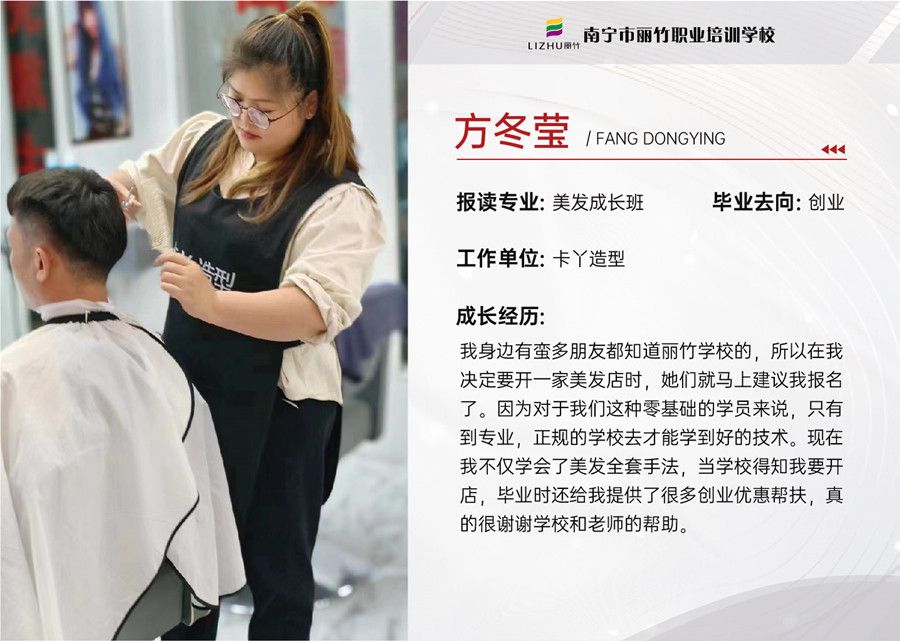 如今,她們自己開(kāi)的美發(fā)店也已經(jīng)在各自的家鄉(xiāng)站穩(wěn)腳跟,生意日益紅火,日子也越過(guò)越好。同學(xué)們深知在事業(yè)上取得的成功,這一切都離不開(kāi)母校的培養(yǎng)。方冬瑩更是眼含熱淚回憶起了剛剛到麗竹學(xué)習(xí)的場(chǎng)景。