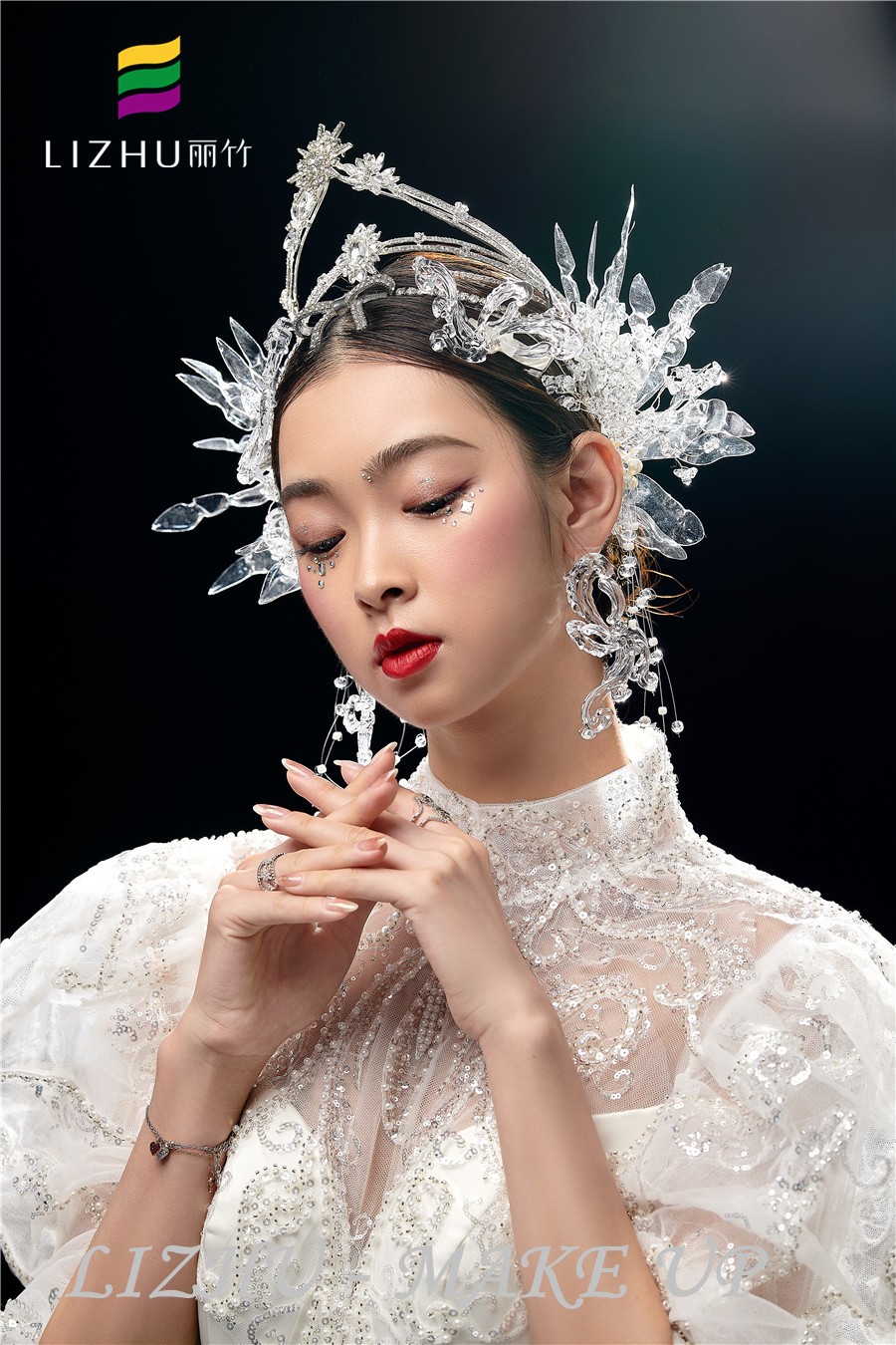 奢華水晶頭飾與重工禮服相呼應(yīng)