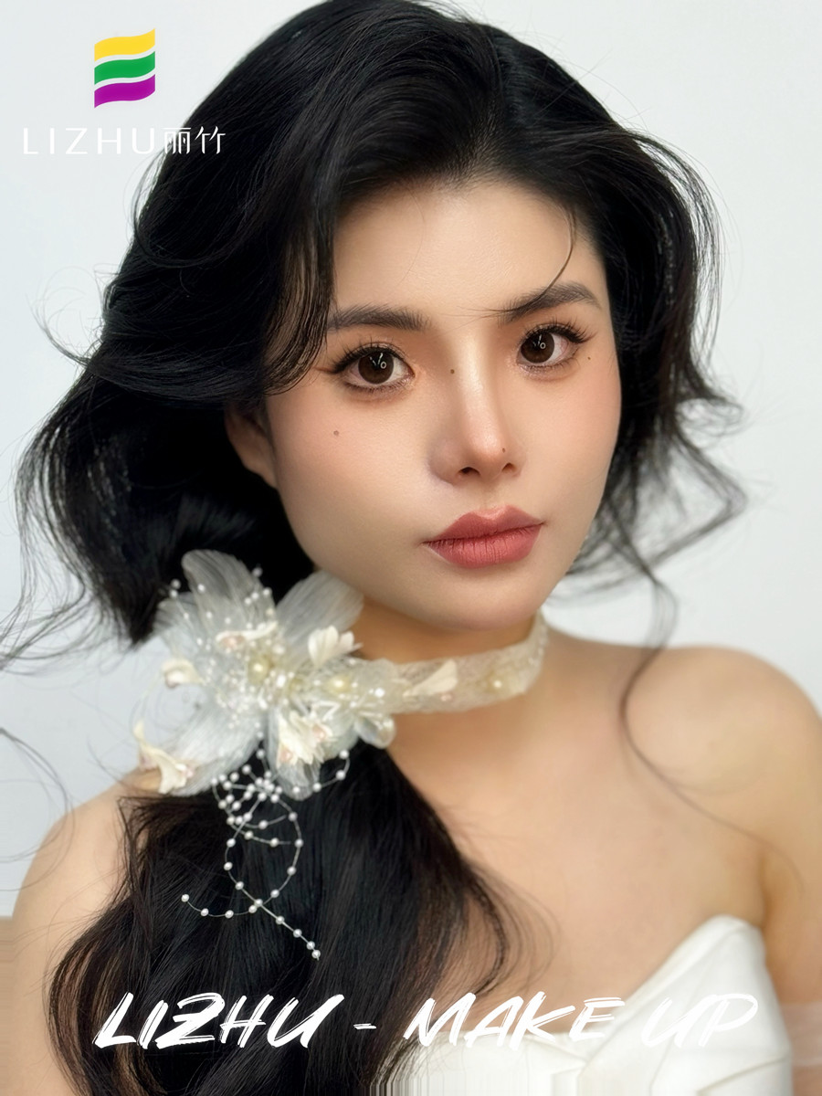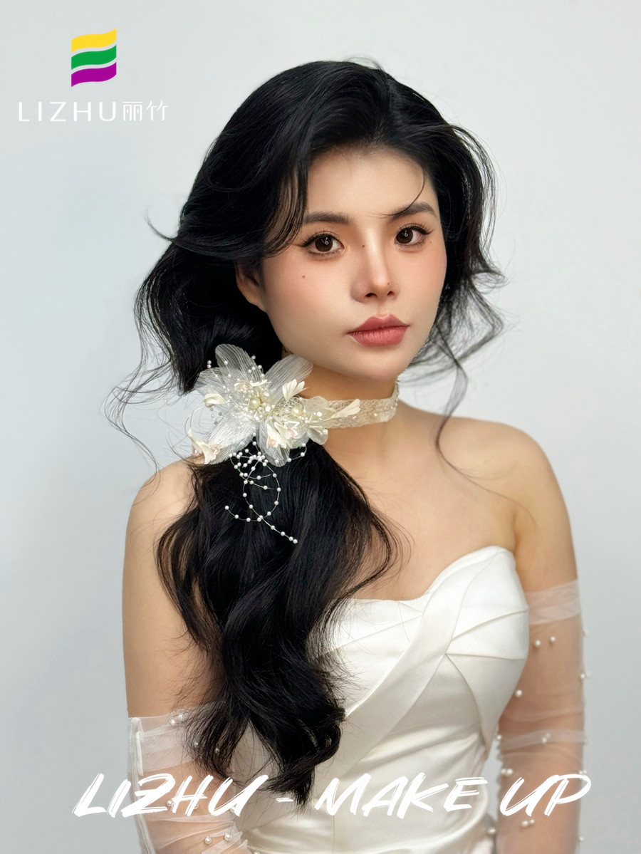 廣西學(xué)化妝影樓、廣西寫真化妝,廣西新娘妝跟妝培訓(xùn)(麗竹寫真化妝培訓(xùn))--- 韓式側(cè)扎紋理新娘:氧氣清新的自然無(wú)痕妝容,優(yōu)雅隨意的紋理韓式卷發(fā),白色蕾絲珠花頭飾側(cè)扎發(fā),打造氣質(zhì)滿滿的元?dú)饷郎倥?